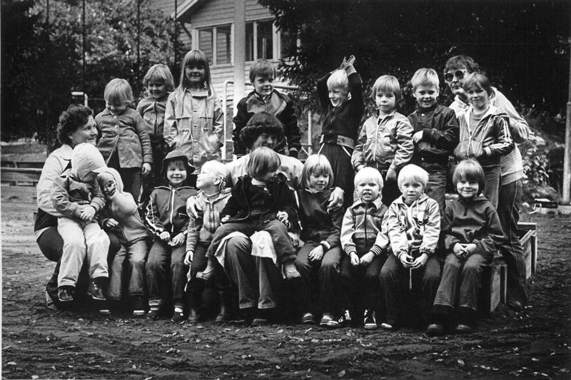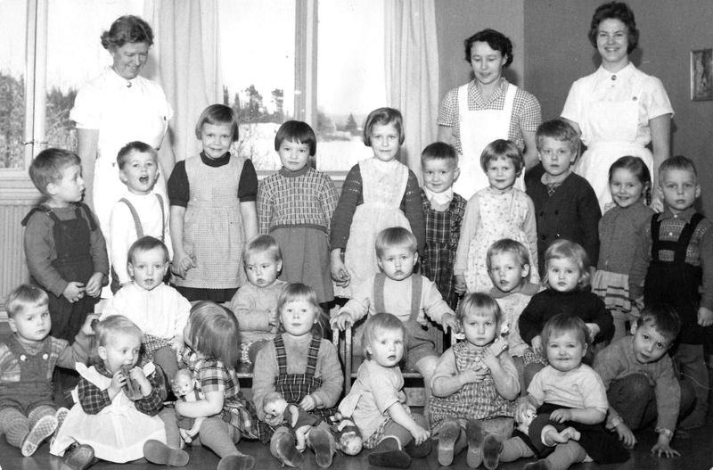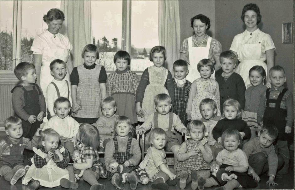 Killon päiväkodin lapsia. Hoitaja vasemmalta sukunimeltään Hoikkala. Kuva: Pirkkala-Seura