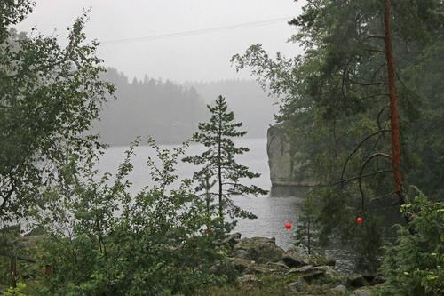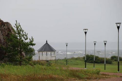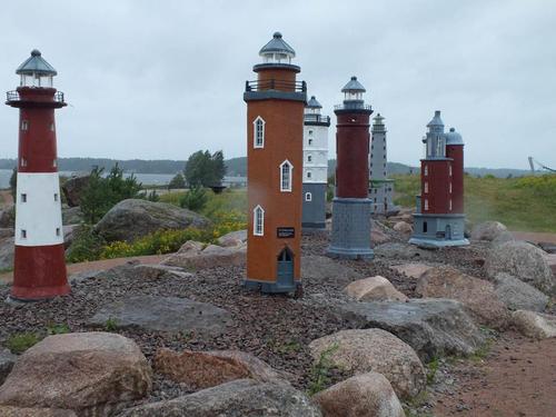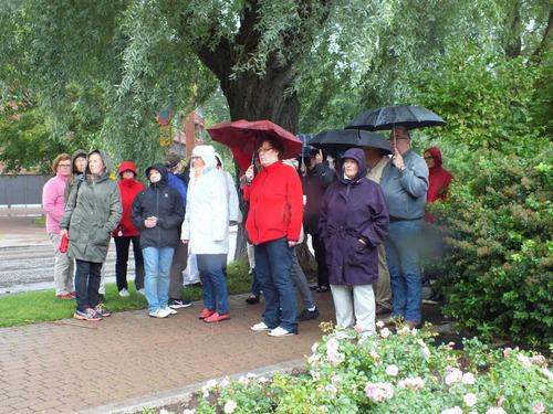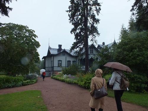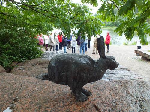 Kotkan oppaamme Airi ja Kari johdattelivat meidät Kotkan veistospromenadin kautta eteenpäin. Ohitimme Toivo Pekkasen puiston ja Sibelius-puiston sekä Josef Stenbäckin suunnitteleman v. 1898 valmistuneen 1500-paikkaisen tiilikirkon. Kotkansaaren kierroksemme jatkui kohti Katariinan meripuistoa. Puisto, jonka pinta-ala on 20 hehtaaria, perustettiin öljysataman paikalle. Työ alkoi säiliökentän puhdistuksella v. 2004 ja puiston rakentaminen jatkuu edelleen. Vaikka satoi ja 15 sekuntimetrin etelätuuli nosti merelle usean metrin aaltoja, osa matkalaisista uskaltautui lyhyelle puistokierrokselle. Muutama sateenvarjo sai lopullisesti siipeensä ja kastuimme. Raju tuuli tuntui kuitenkin yllättävän lämpimältä, kun asteita oli noin 15.