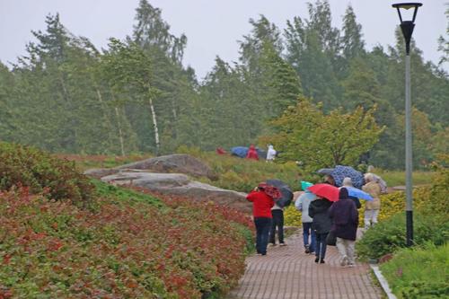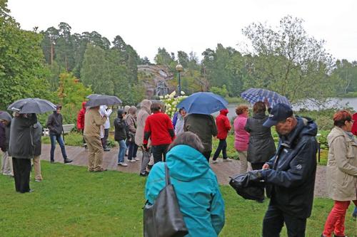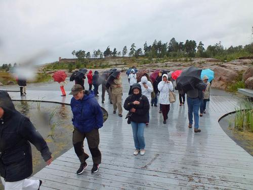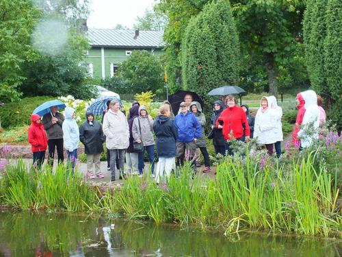 Opastetuilla kiertokävelyillä Katariinan meripuistossa ja Sapokan vesipuistossa päästiin tutustumaan useaan kertaan palkittuun kotkalaiseen puistorakentamiseen ja 15 m/s puhaltaneeseen merituuleen, joka teki selvää jälkeä kampauksista ja sateenvarjoista.