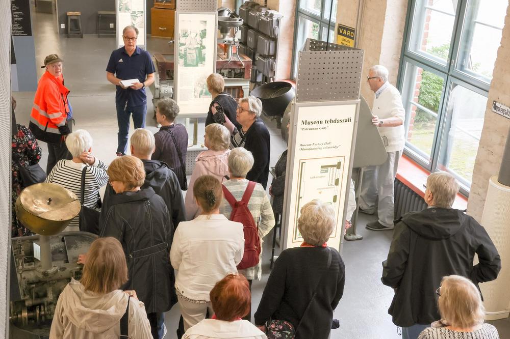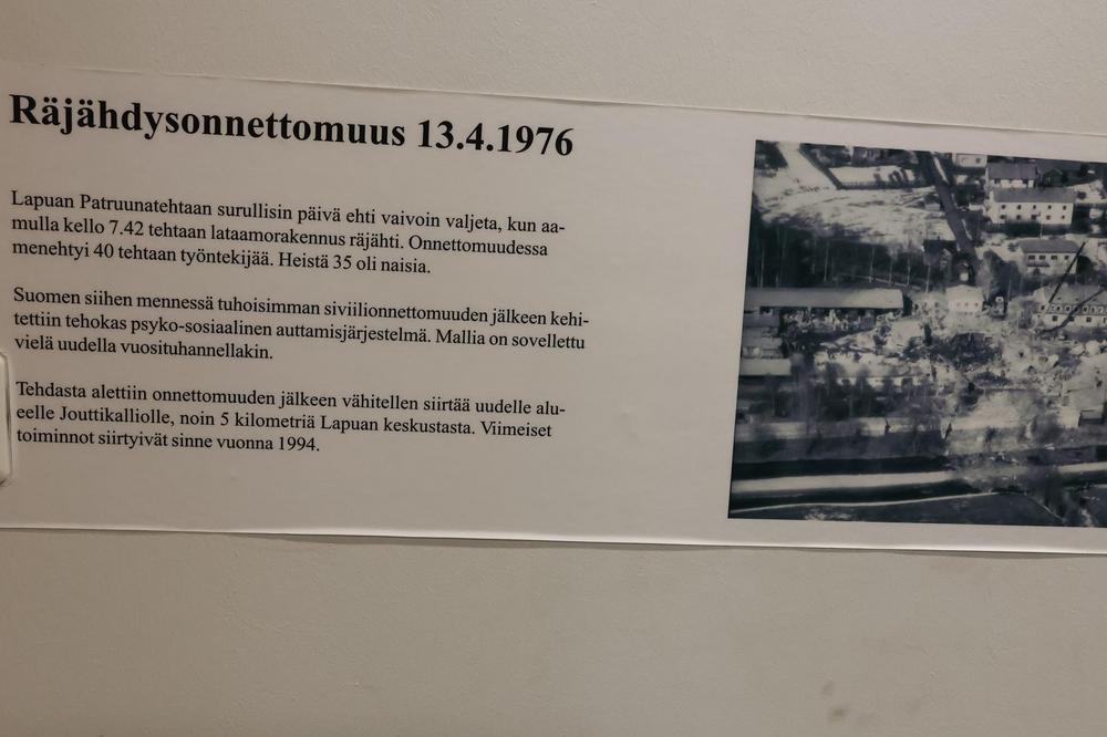 Kokoonnuimme Alajoki- saliin, jossa oppaamme Ensio kertoi meille alueen historiasta. Kävimme Patruunatehtaan museossa, Pohjanmaan valokuvakeskuksessa, Lapuan taidemuseossa ja museokaupassa sekä räjähdysonnettomuuden tunnelmallisessa muistokappelissa, jossa ovat räjähdyksessä kuolleiden työntekijöiden kuvat ja tiedot, enkeliveistos ja 40-haarainen kynttelikkö. Söimme maittavan lounaan ravintola Isossa Prässissä, jonka tiloissa aikanaan valmistettiin ammusten kuoria. Tästä on muistona keskellä ravintolatilaa seisova valtavan kokoinen ilmatorjuntatykin kuorien valmistuksessa käytetty prässi.